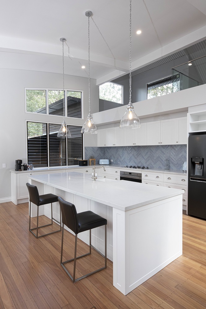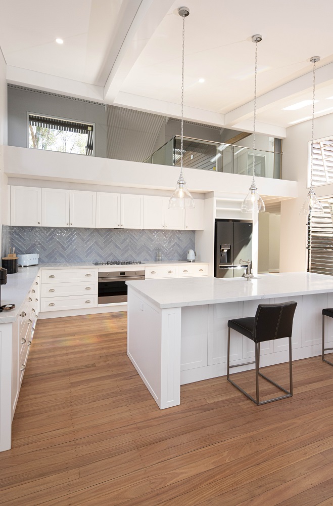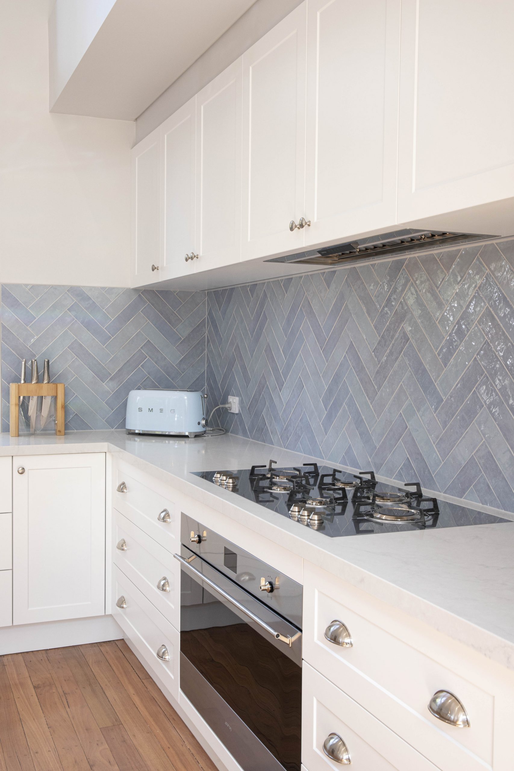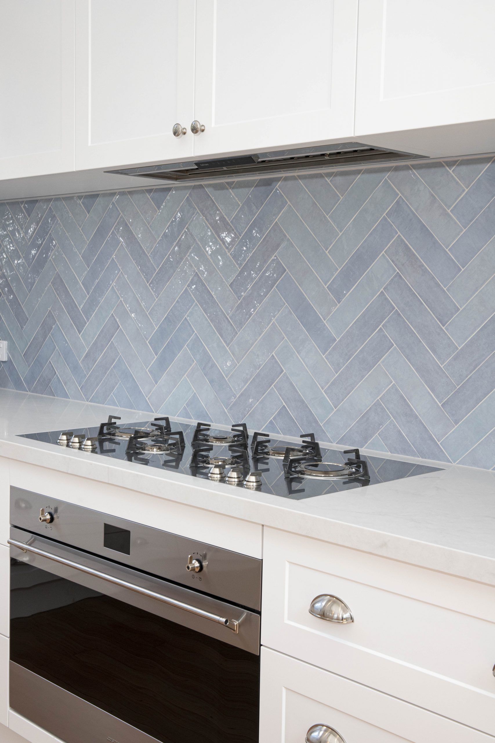 The splashback features a hand cut ocean varied coloured subway laid in herringbone pattern for subtle beauty.