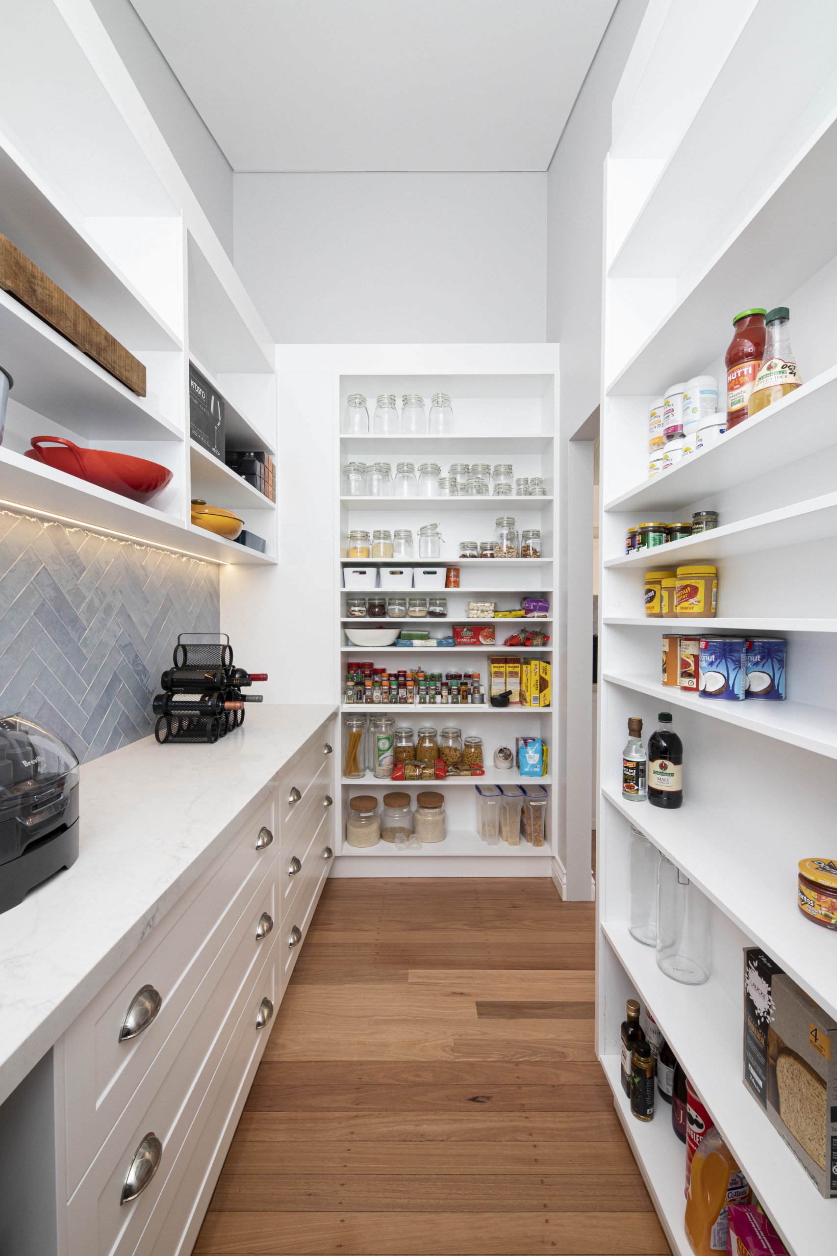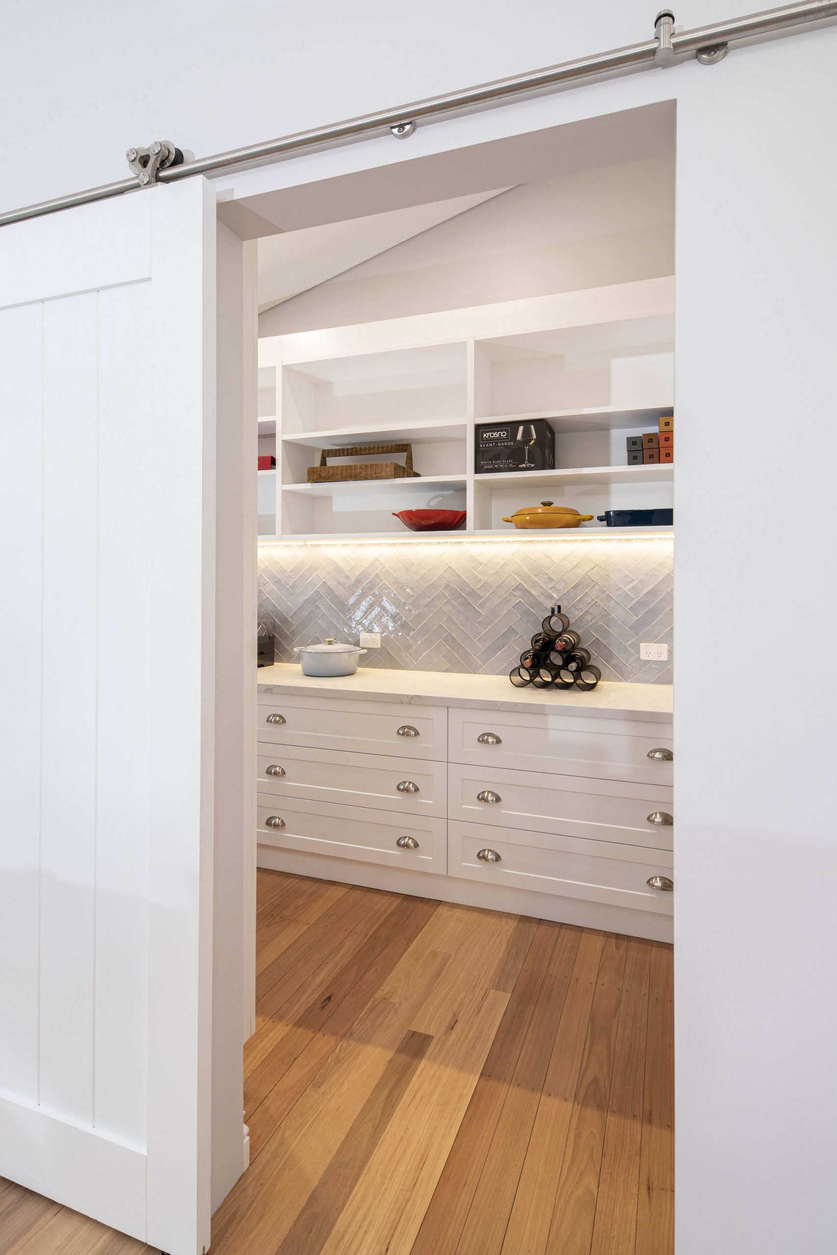 The walk-in pantry is a generous storage area filled with purpose built fixed shelving to maintain the strong custom design to house specific pantry goods, such as a cannery and larger boxes and jars. Beautiful barn style doors separate the main kitchen and dining space from the walk-in pantry, perfect for closing off whilst entertaining guests. The custom finish of cabinetry allows a high end finish to both spaces, an important feature for our clients.